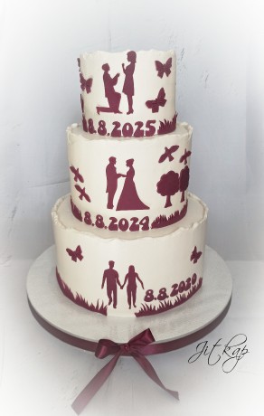 Světlý korpus, malinový gel, mascarpone krém a maliny, uprostřed čoko + višně, povrch bílkový krém.